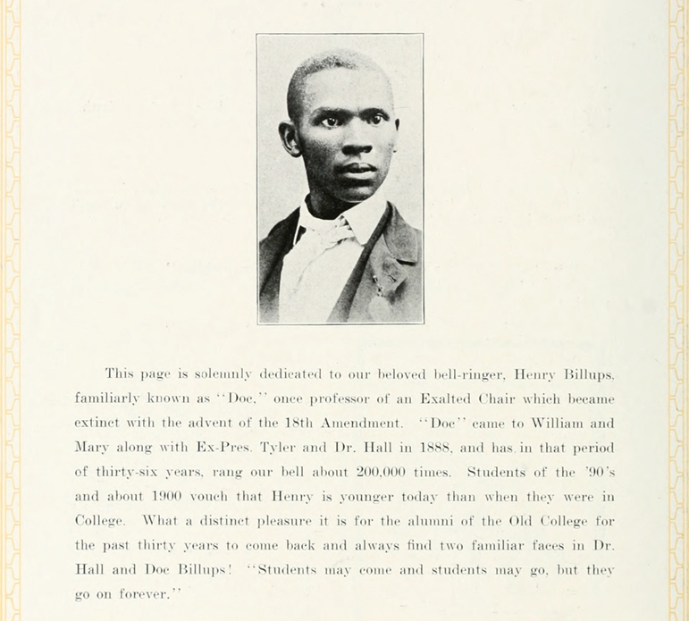 Other such acknowledgements have occurred, though rarely. Henry Billups, the Wren custodian and bell-ringer, worked at the College from 1888 to close to his death in 1955 and was much honored and appreciated. See the account by Trudier Harris at the LP site and this tribute in the 1926 Colonial Echo: